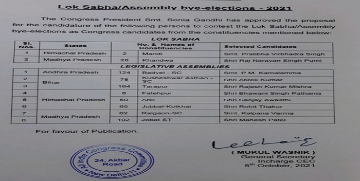 कांग्रेस पार्टी के जनरल सेक्रेटरी मुकुल वासनिक ने दिल्ली से ही बिहार विधानसभा की दो खाली सीटों पर हो रहे उपचुनाव को लेकर उम्मीदवारों के नाम की घोषणा की। कांग्रेस पार्टी ने मुंगेर जिले के तारापुर सीट से राजेश कुमार मिश्रा और दरभंगा जिले की सुरक्षित सीट कुशेश्वर स्थान से अतिरेक कुमार को टिकट दिया है।