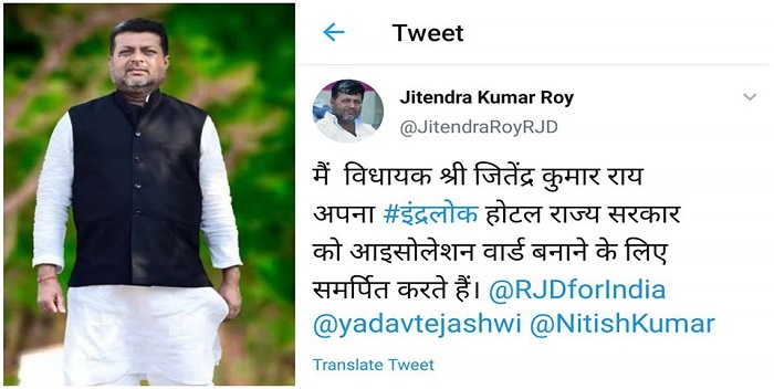 उन्होंने ट्विटर पर लिखा कि “मैं विधायक श्री जितेंद्र कुमार राय अपना #इंद्रलोक होटल राज्य सरकार को आइसोलेशन वार्ड बनाने के लिए समर्पित करते हैं।