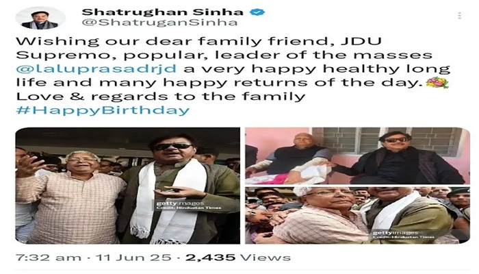 दरअसल, आसनसोल से त्रिणमूल कांग्रेस से सांसद शत्रुघ्न सिन्हा ने बुधवार काे एक्स पर लालू यादव काे बड़े जोशोखरोश के साथ जन्मदिन की शुभकामनाएं दीं। लेकिन इस बधाई के साथ उन्होंने ऐसा राजनीतिक पंच मार दिया कि राजद नेता और कार्यकर्ता कुछ समय के लिए असमंजस में पड़ गये। शत्रुघ्न सिन्हा ने एक्स पर लिखा “हमारे प्रिय पारिवारिक मित्र, जदयू सुप्रीमो, लोकप्रिय, जन-जन के नेता लालू प्रसाद को जन्मदिन की शुभकामनाएं।”