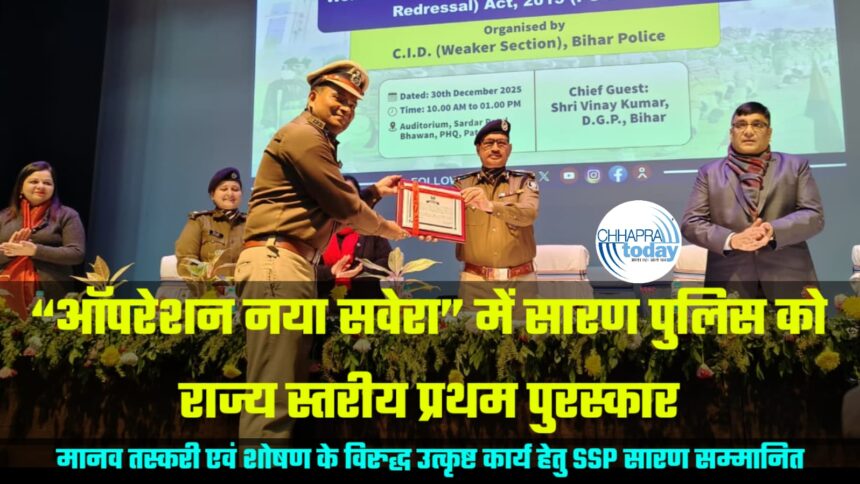Patna/Chhapra: मानव तस्करी, बाल श्रम एवं महिलाओं के शोषण के विरुद्ध प्रभावी कार्रवाई के लिए सारण पुलिस को बड़ी उपलब्धि मिली है। बिहार पुलिस मुख्यालय के अपराध अनुसंधान विभाग (कमजोर वर्ग) द्वारा आयोजित राज्य स्तरीय कार्यशाला के दौरान “ऑपरेशन नया सवेरा” अभियान में उत्कृष्ट प्रदर्शन के लिए सारण जिला को राज्य में प्रथम स्थान प्रदान किया गया।