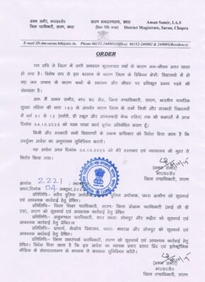 Chhapra: सारण जिला में जारी अतिवृष्टि को लेकर सुरक्षा के दृष्टिकोण से एहतियात बरतते हुये जिला दंडाधिकारी सह जिलाधिकारी अमन समीर द्वारा जिला के सभी विद्यालयों एवं आंगनबाड़ी केंद्रों को आज शनिवार के लिये बंद रखने का आदेश दिया गया है.