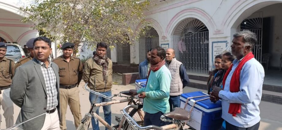 Chhapra: सारण जिला पदाधिकारी के द्वारा प्रधानमंत्री मत्स्य संपदा योजना के तहत साइकिल सह आइस बॉक्स का 15 लोगो के बीच वितरण किया गया। इस योजना के तहत 40% अनुदान पर एवं महिलाओं को 60% अनुदान पर साइकिल स आइस बॉक्स का वितरण किया गयाा। जिला पदाधिकारी ने सभी को संबोधित करते हुए कहा की यह सरकार के द्वारा चलाई गई योजना से स्वच्छ एवं स्वास्थ्यवर्धक मछलियों को उपभोक्ताओं के बीच पहुंचने में कारगर सिद्ध होगा । जिले में मत्स्य का उत्पादन जितने तेजी से हो रही है उसके लिए बाजार का होना आवश्यक है सरकार इसके लिए लगातार प्रयत्नशील है।