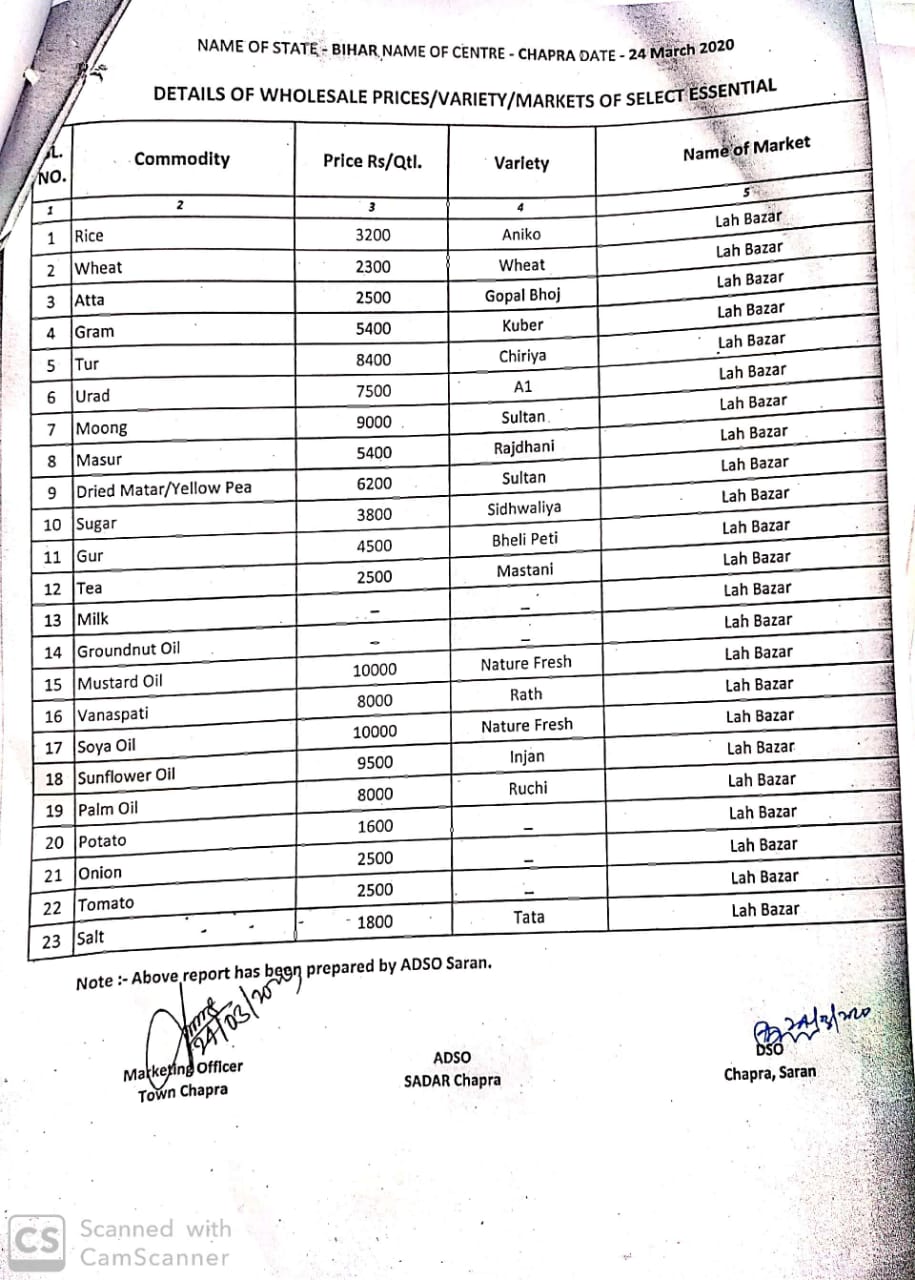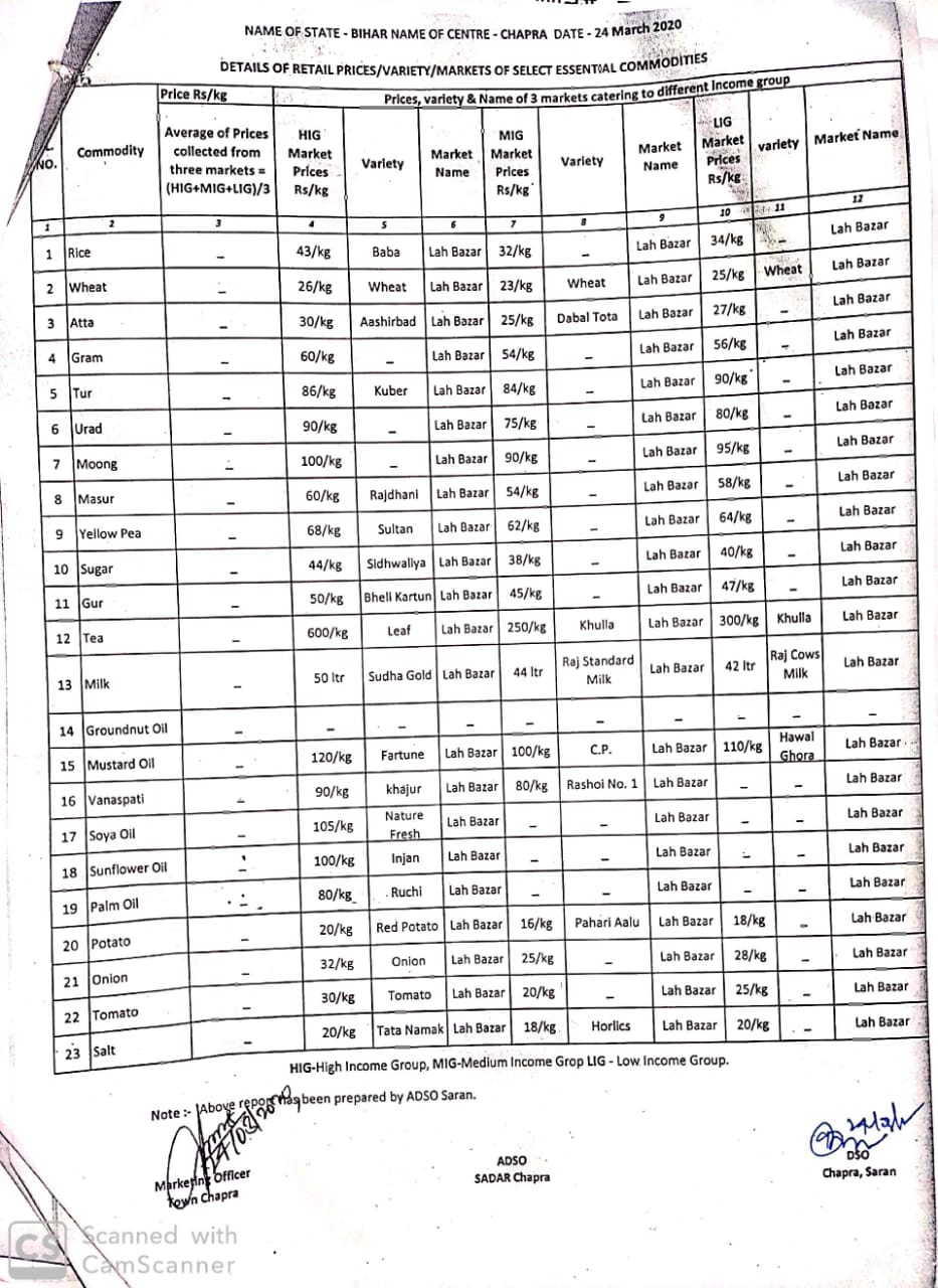 Chhapra: कोरोना के खतरे को देखते हुए देशभर में जैसे ही लॉकडाउन की घोषणा हुई, सारण में कई राशन दुकानदारों द्वारा कालाबाजारी शुरू कर दी गई. मनमाने दाम पर लोगों को राशन सामग्री बेचनी शुरू कर दी गई. लोगों की शिकायत के बाद सारण जिला प्रशासन ने इस पर संज्ञान लिया है. इसके लिए जिलाधिकारी सुब्रत कुमार सेन के निर्देश पर सभी जरूरी खाद्य पदार्थो का मूल्य जिला आपूर्ति पदाधिकारी के द्वारा निधारित कर दिया गया है.