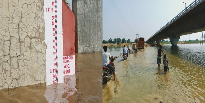 डोरीगंज: गंगा के जलस्तर में चौथे दिन भी वृद्धि जारी है. जिसके कारण दियारे क्षेत्र के रायपुर, बिंदगांवा, कोटवापट्टी रामपुर और बरहारा महाजी पंचायतों में बाढ़ का खतरा मंडराने लगा है. आरा छपरा पुल पंचायतों का संपर्क भंग हो गया है. स्थानीय लोगों के अनुसार इन इलाकों का आरा-छपरा पुल से सम्पर्क पूरी तरह टूट चुका है. पुल से जुड़े एप्रोच रोड पर दो से तीन फीट पानी बह रहा है. लाठी के सहारे रास्ते का अनुमान लगाकर लोग आरा-छपरा पुल पार कर रहे हैं. कोटवापट्टी रामपुर पंचायत के दयालचक निवासी संटू तिवारी ने बताया कि गंगा के जलस्तर में लगातार वृद्धि के कारण गांव के निचले इलाके में पानी से घिर चुके हैं.