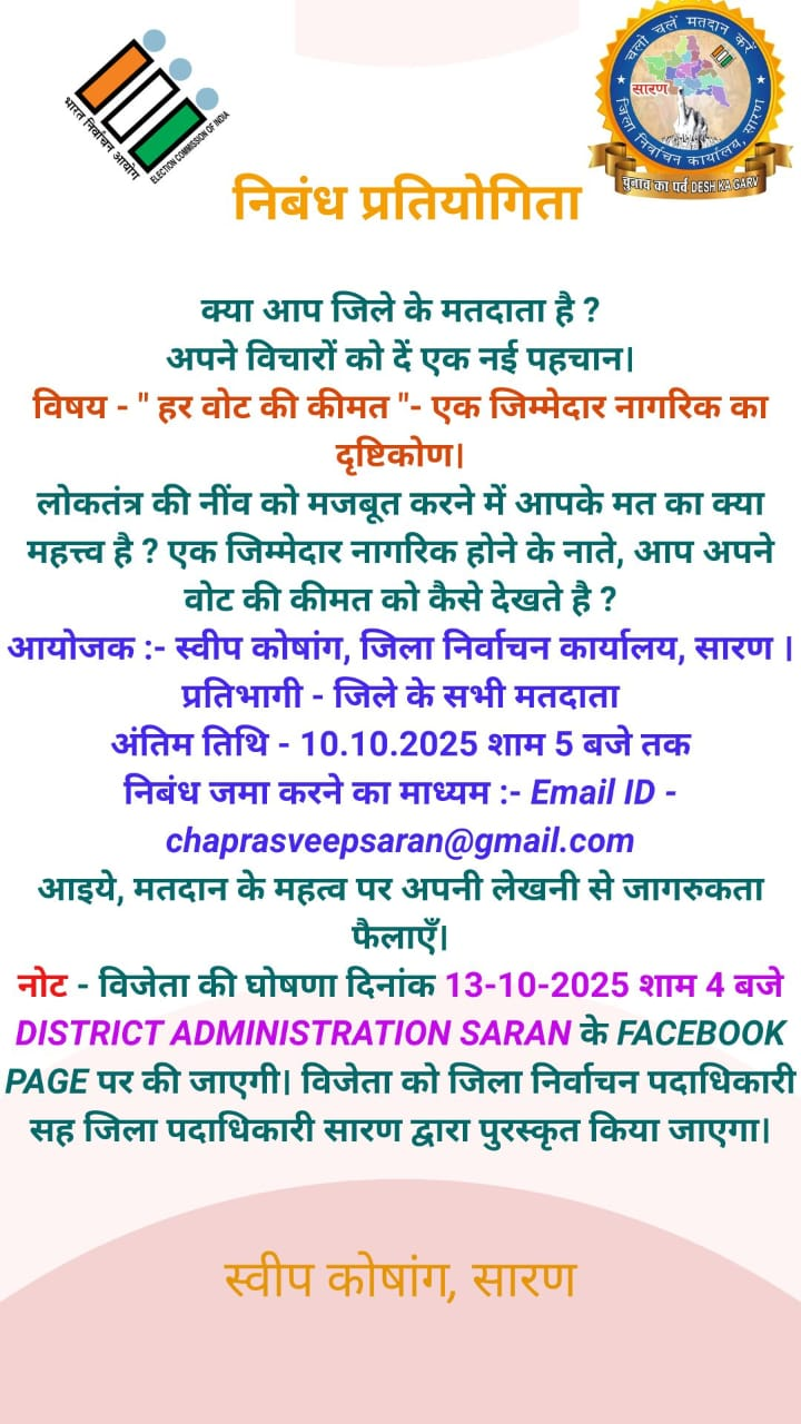 Chhapra: बिहार विधानसभा चुनाव में मतदान के प्रतिशत को बढ़ाने के उद्देश्य से मतदाताओं को जागरूक किया जा रहा है। इसी क्रम में स्वीप कार्यक्रम अन्तर्गत निबंध प्रतियोगिता आयोजित की जा रही है। इस प्रतियोगिता में सारण जिले के मतदाता शामिल होकर पुरस्कार जीत सकते हैं।