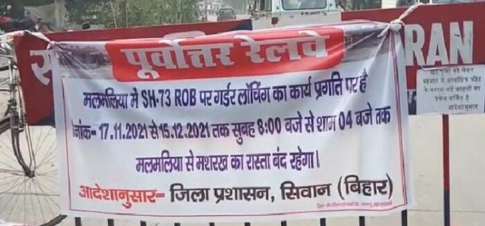 थानाध्यक्ष राजेश कुमार ने एस एच-90 यदु मोड़ के पास बास बल्ला लगाकर आवागमन बंद करने का बैनर लगा दिया. आपकों बता दें कि सिवान जिले के भगवानपुर हाट थाना क्षेत्र के मलमलिया सिवान शीतलपुर एसएच-73 पर मशरक महाराजगंज रेलखंड पर ओवरब्रिज निर्माण में गार्डर लांचिंग के लिए 18 नवम्बर से 15 दिसम्बर तक आवागमन पूरी तरह से बंद कर दिया गया है.