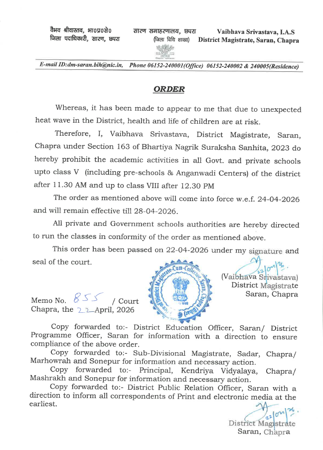 Chhapra: सारण में अत्यधिक गर्मी और धूप को लेकर स्कूलों के संचालन का समय में परिवर्तन किया गया है। वर्त्तमान में सारण जिला में जारी हीट वेव की स्थिति को लेकर जिला दंडाधिकारी सारण वैभव श्रीवास्तव द्वारा सभी सरकारी एवं निजी विद्यालयों में कक्षा 5 तक के लिये पूर्वाह्न 11:30 बजे के बाद एवं कक्षा 8 तक के लिये अपराह्न 12:30 बजे के बाद किसी भी तरह की शैक्षणिक गतिविधि पर रोक लगाई गई है।