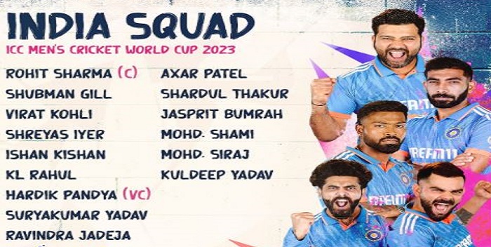विश्व कप के लिए भारतीय टीम इस प्रकार है: रोहित शर्मा (कप्तान), शुभमन गिल, विराट कोहली, श्रेयस अय्यर, केएल राहुल, ईशान किशन, सूर्यकुमार यादव, हार्दिक पंड्या (उप-कप्तान), रवींद्र जडेजा, अक्षर पटेल, शार्दुल ठाकुर, जसप्रीत बुमराह, कुलदीप यादव, मोहम्मद शमी, मोहम्मद सिराज।