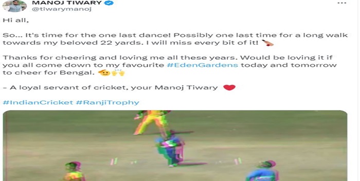 मनोज तिवारी ने शनिवार को एक्स पर लिखा, “सभी को नमस्कार, तो… संभवतः अपने प्रिय 22 गज की पिच पर यह एक आखिरी समय है! मुझे इसकी हर चीज़ याद आएगी! इतने वर्षों तक मुझे प्रोत्साहित करने और प्यार करने के लिए धन्यवाद। अगर आप सभी कल और परसों मेरे पसंदीदा ईडनगार्डन में बंगाल का उत्साह बढ़ाने आएंगे तो बहुत अच्छा लगेगा। क्रिकेट का एक वफादार सेवक, आपका मनोज तिवारी।”