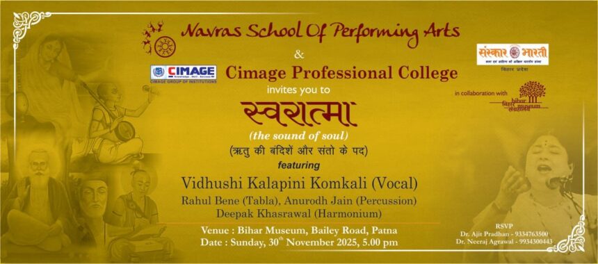 Patna: नवरस स्कूल ऑफ परफॉर्मिंग आर्ट्स, सीमेज प्रोफेशनल कॉलेज और संस्कार भारती, बिहार प्रदेश के संयुक्त तत्वावधान में रविवार को ‘स्वरात्मा’ कार्यक्रम का आयोजन किया जाएगा। यह सांस्कृतिक कार्यक्रम बिहार संग्रहालय परिसर में आयोजित होगा।