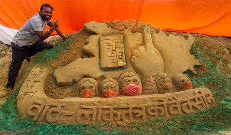 अशोक कुमार ने अपने चिरपरिचित अंदाज में सैंड आर्ट बना कर वोटरों को जागरूक करने की कोशिश की है. इस बार उन्होंने अपने सैंड आर्ट में इवीएम, मास्क और अंगुली पर लगा स्याही के निशान को दर्शाया है. साथ ही एक स्लोगन लिखा है. जिसमे लिखा है- “आपका वोट लोकतंत्र की वैक्सीन है”
