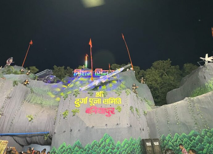 Chhapra: बनियापुर का दुर्गा पूजा पंडाल इस बार श्रद्धालुओं और दर्शकों के लिए विशेष आकर्षण का केंद्र बना हुआ है। यहां “ऑपरेशन सिंदूर” की थीम पर तैयार पंडाल देश के सैनिकों के शौर्य और बलिदान को समर्पित है। आयोजकों ने बताया कि इस थीम का उद्देश्य देशभक्ति की भावना को प्रज्वलित करना और युवाओं को सेना के प्रति प्रेरित करना है।